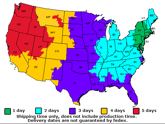 Files received after 1:00 PM EST and before 5:00 PM EST for same day shipping will be charged a 50% premium on print only.(Must call to confirm availability.)